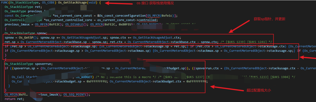下面截取一段代码,解释了一下os如何获取栈的使用情况。在使用过程中,我们用户可以利用这个api进行一些自己的monitor.