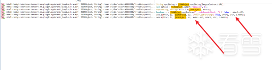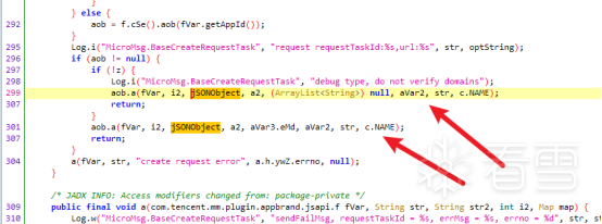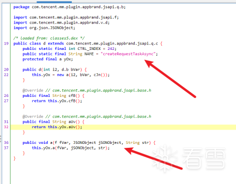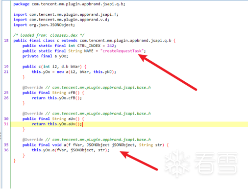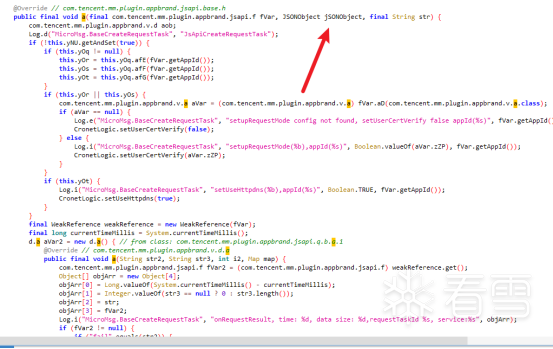 这个函数是关键,通过动态hook调试发现,每个wx.xxx的api通过经过invokeCallbackHandler,由这个函数通过调用native函数最终调用到具体的java实现,其他的参数我们先不管,我们看最后一个参数String类型,通过动态hook调试发现这个参数保存的就是具体的java层实现的名字,wx.request对应的java层的api名字如下图所示: