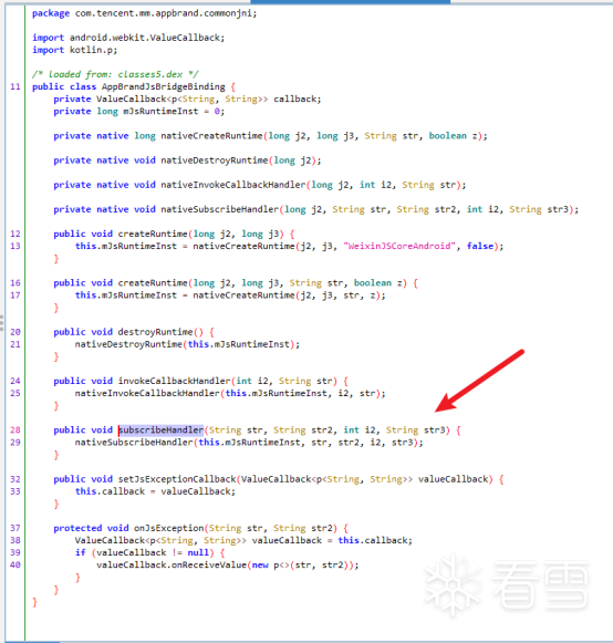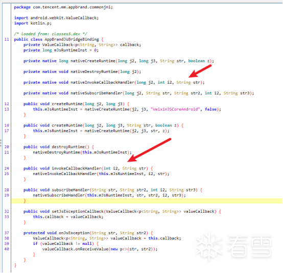 首先我们要知道,js代码中的wx.xxx字符串一定会在java层中出现吗?答案是否定的,wx.getLocation和其他一些api的名字确实会在java层出现,java层的字段表现形式就是 String NAME = “getLocation”,但是我们今天要分析的api wx.request在java层中不叫这个名字,因此在jadx反编译完微信以后,直接搜索该字符串是搜索不到的。既然搜索不到那就换一个思路,微信小程序wx.xxx最终都会通过WxJsApiBridge调用到java层对应的api实现,所以我们可以通过frida hook这个类相应的方法来确定wx.request在java层对应的api叫什么名字,通过jadx搜索发现有一个类叫做com.tencent.mm.appbrand.commonjni.AppBrandJsBridgeBinding。