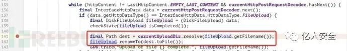 如上图,fileUpload 是用户可控的内容,则 filename 也是可控的,所以可以修改 filename 进行跨目录写操作