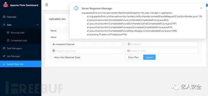 flink默认是没有访问权限的。该漏洞本质是一个反序列化漏洞,上传的jar会进行反序列化的操作。