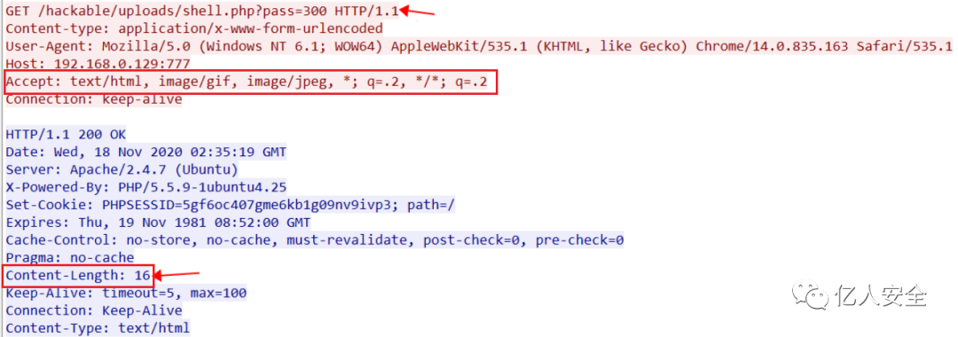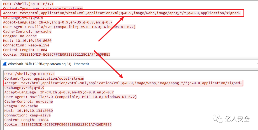 冰蝎中使用的 Accept 字段与常规浏览器使用的不同,且每次请求使用的 Accept 内容都相同