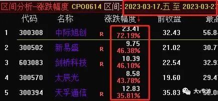 比如3.17号板块开始上涨,到3.27号,涨幅排序,中际旭创排名第一;