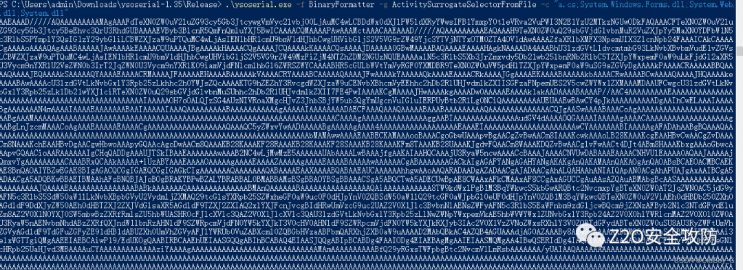 命令中  -f 指定的是.net程序中的序列化类,-g 是ysoserial.net工具中的攻击链, 这里指定的是ActivitySurrogateSelectorFromFile链,这个攻击链可加载自定义的程序集。-c 是构造的程序集(a.cs),后面的dll文件是.NET Framework中的一个核心DLL文件,包含了一些相关的类和方法(自行加载,不需要构造)