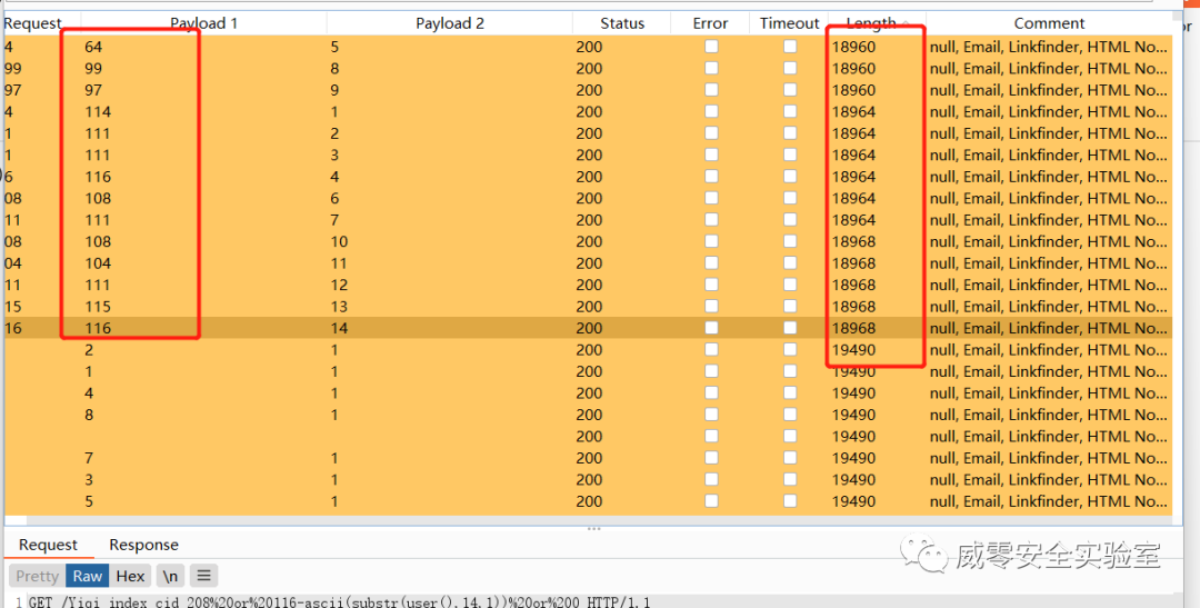 接着就通过php脚本语言,判断数据库为mysql。构造payload:/Yiqi_index_cid_208 or 14-length(user()) or 0 得到用户长度