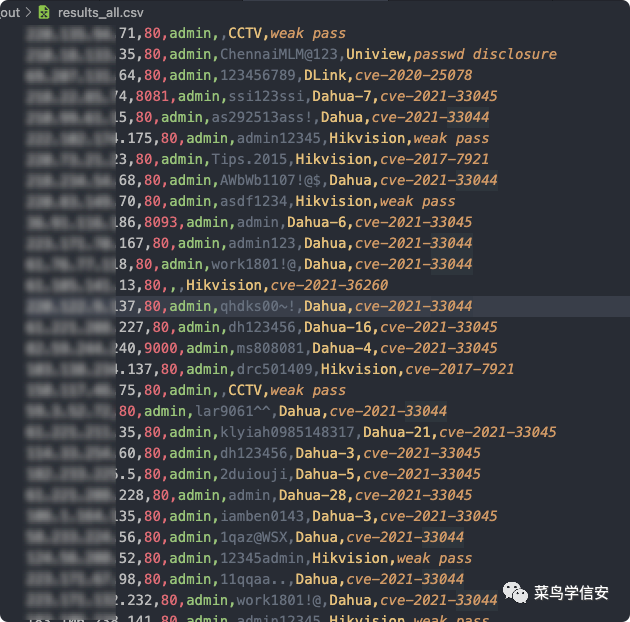 results.csv 里保存了完整的结果, 格式为: ip,端口,设备类型,用户名,密码,漏洞条目: