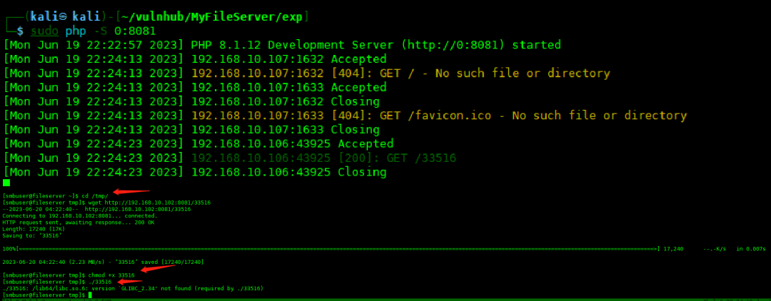 通过php开启临时http服务,然后靶机用wget下载,但是运行报错