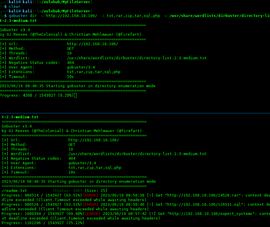 gobuster dir -u http://192.168.10.106/ -x txt,rar,zip,tar,sql,php -w/usr/share/wordlists/dirbuster/directory-list-2.3-medium.txt