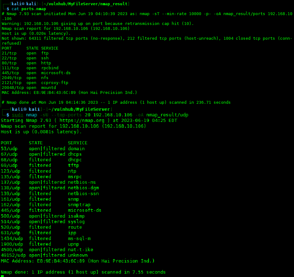 # --min-rate:发包的最小速率# -sT,-sU:采用TCP、UDP扫描# --top-ports [number]:扫描常用的端口sudo nmap -sT --min-rate 10000 -p- 192.168.10.106 -oA nmap_result/portssudo nmap -sU --top-ports 20 192.168.10.106 -oA nmap_result/udp