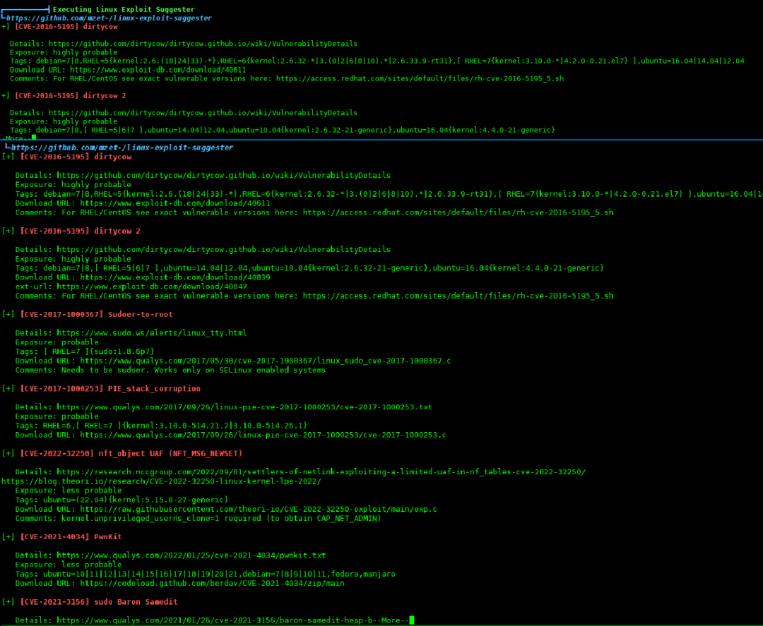 ./linpeas.sh | more根据信息可以看出CVE-2016-5195和CVE-2016-5195可能性最高,我们就尝试这2个EXP CVE-2016-5195失败
