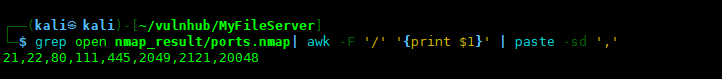 # grep 抓取包含Open字样行的内容# awk -F '/' :-F是分隔符,通过/来进行划分打印输出分组1的内容即端口号# paste -sd ',':-s 表示串行合并,-d ','表示用,进行分割grep open nmap_result/ports.nmap | awk -F '/' '{print $1}'| paste -sd ','