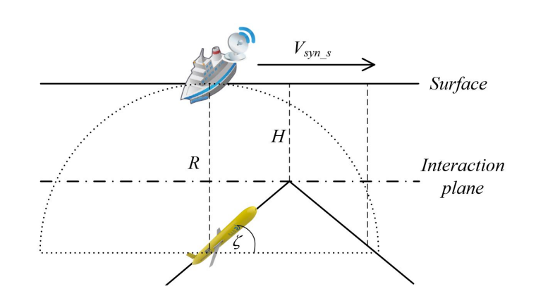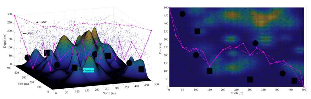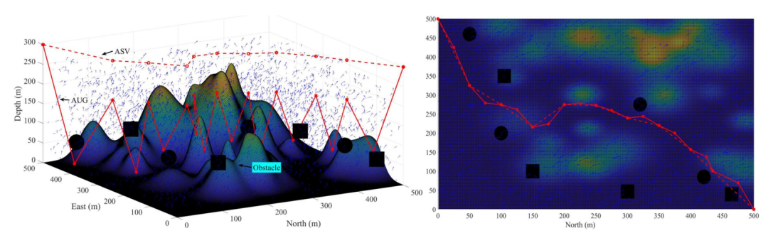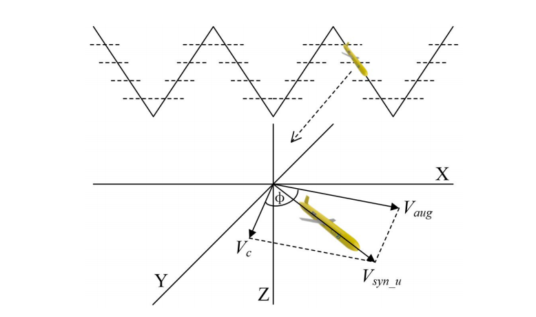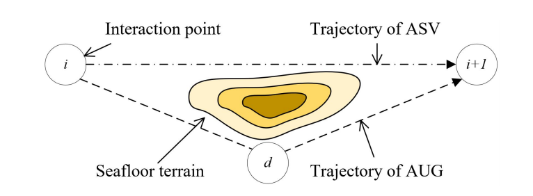 AUG和ASV通过协作运动搜索勘探区域。然而,ASV在水面上航行没有障碍物,而AUG在海底地形不平坦的海底航行。因此,应考虑ASV的速度可能不同于水平速度,如图5所示。