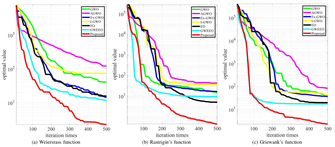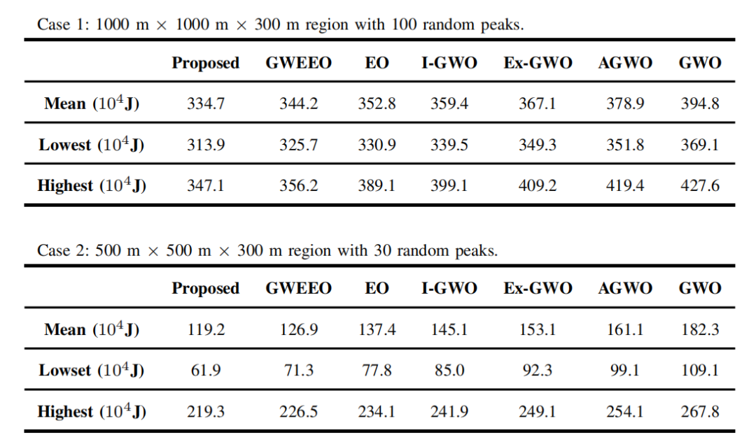 本文主要与GWO的最新变体以及融合元启发式算法进行实验对比,对比的指标有:协作路径图、不同场景下能耗成本统计、不同基准函数下的算法收敛性能等。