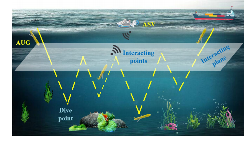 所提出的CPP-HA的应用场景如图2所示,AUG通过调整每个潜水/漂浮周期的滑翔角度和浮力,以锯齿形轨迹进行水下运动。它通过评估包括洋流和水下地形在内的环境因素来选择潜水位置,收集有关该地区的信息,然后漂浮到交互平面上与水面上的ASV进行交互。ASV监测AUG在交互平面中的轨迹,同时接收从海底收集的数据。交互平面的深度由AUG的通信范围确定。