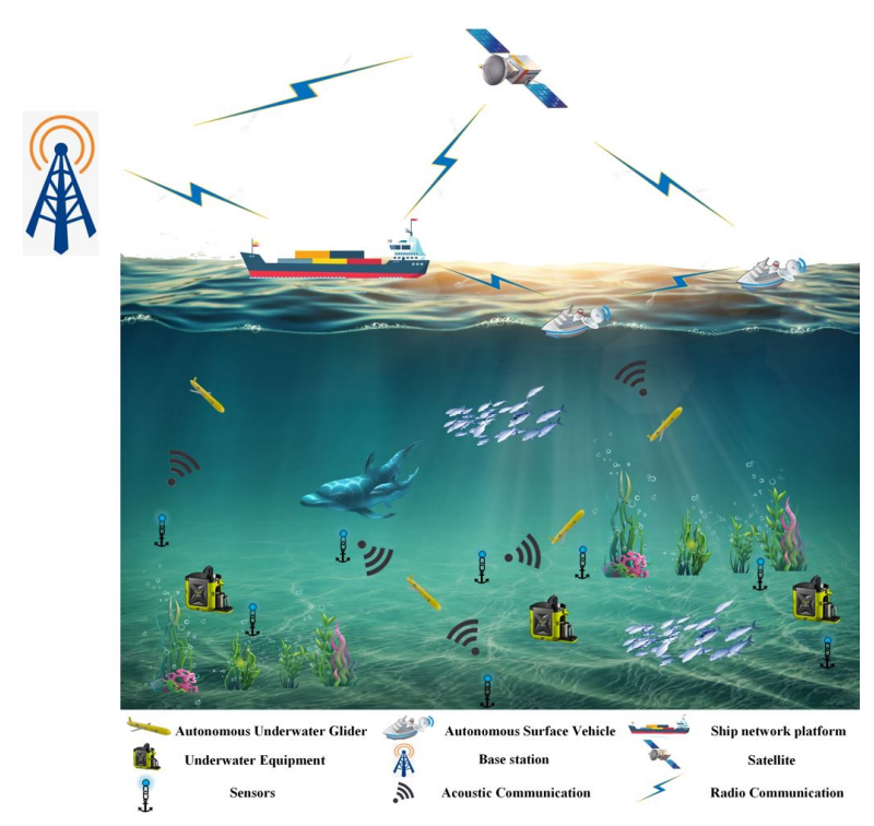 最近的技术,如空地一体化网络(SAGIN)、无人机辅助物联网(UAV-IoT)和远程物联网(IoRT)已经证明了智能车辆在陆地和空中协作完成复杂任务的可行性。同时,实现水下物联网(IoUT)的技术要求也提出了自主海洋车辆(AMV)有效协作的必要性,这也是探索复杂海洋环境促进人类社会可持续发展的基本问题之一。因此,通过AMVs的协作实现IoUT应用的一种方法是根据不同的功能优势将不同的任务分配给异构的AMVs。如图1所示,自主式水面航行器(ASV)、自主式水下滑翔机(AUG)、自主式水下航行器(AUV)等自主式水下车辆在海底勘探中发挥着重要作用,本文重点研究了AUG与ASV的协作运动。AUG是一种浮力驱动的AMV,它可以移动重心来改变姿态,并以锯齿形轨迹在水下运动。AUG的优势是它只在改变姿态时消耗能量,这意味着与其他AMV相比,它在水下航行时使用的能量要少得多。