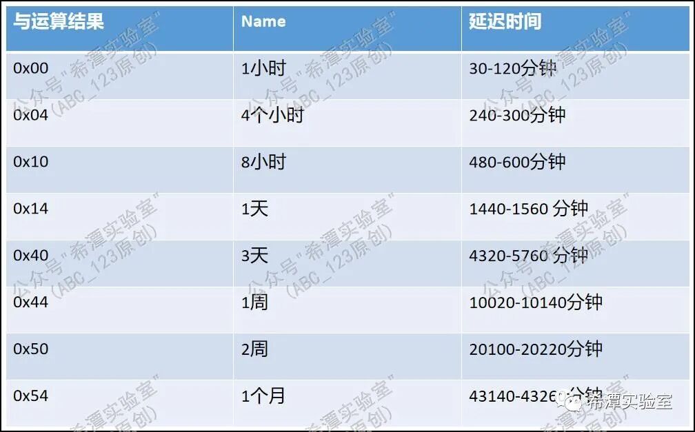 C2的域名服务器不仅仅通过将dga域名解析到不同的ip地址来控制Sunburst后门的行为,还通过控制解析IP地址的最后8位字节来控制Sunburst后门的下一次执行命令的等待时间。例如,C2服务端将dga域名解析为96.31.172.116的ip地址时,Sunburst后门会将IP地址的最后一个八位数与掩码0x54进行与运算得到一个“与结果”,然后参考下表中选择一个延时时间,在该间隔内Sunburst随机选择一个延时时间。