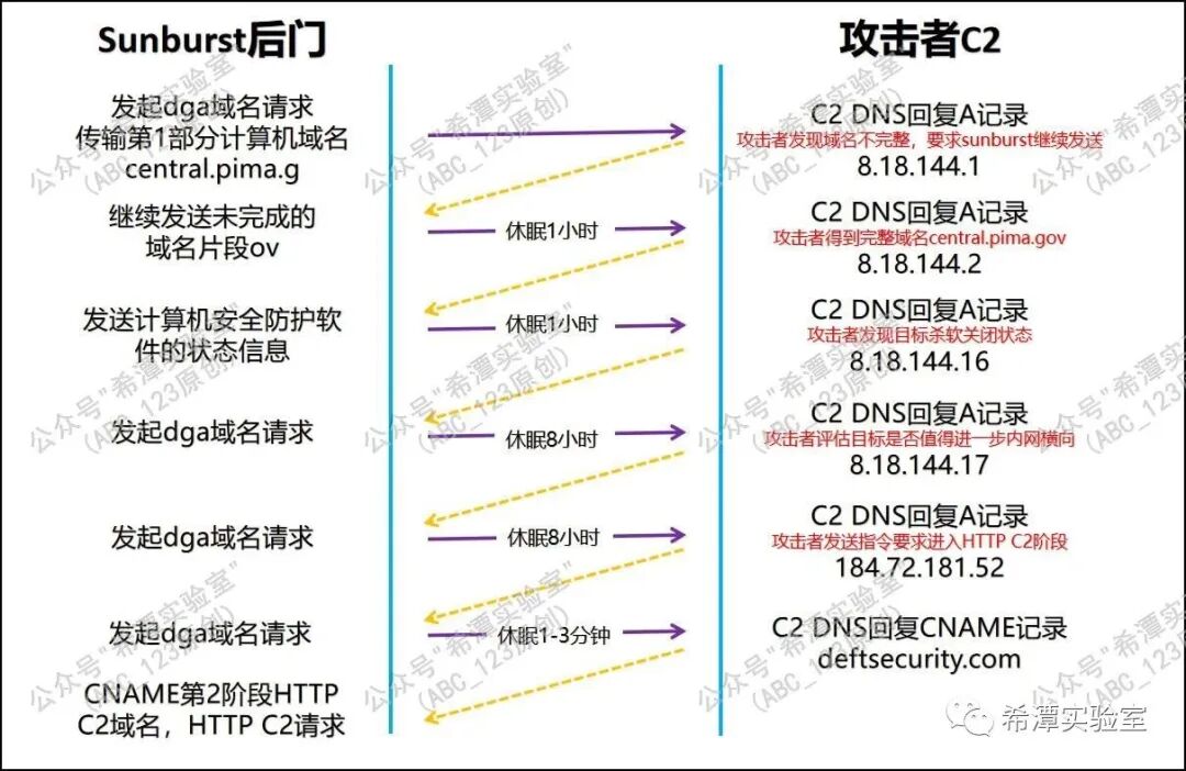 注:国外很多分析文章对于Sunburst后门的通信过程说法不一,很多细节描述存在很多矛盾的地方。ABC_123按照自己的理解,综合各个安全公司的文章进行了复盘,其中难免有疏漏之处,敬请修正。