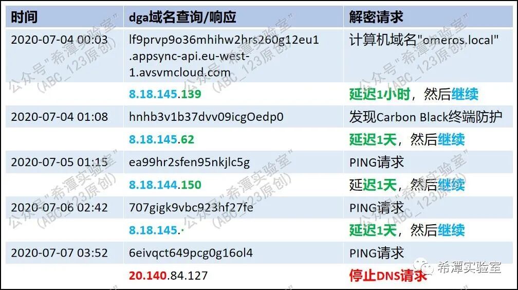 蓝色部分CONTINUE的IP地址。当C2服务端攻击者将dga域名解析成图中蓝色部分的IP地址时,说明C2服务端的攻击者还未决定目标是否是有价值的目标,是否要进一步渗透,所以需要Sunburst后门会继续发起dga域名请求,以便接收攻击者发送下一步指令。
