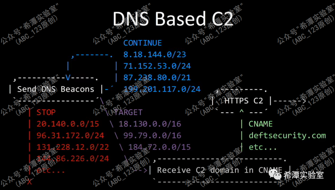 紫色的TARGET部分的IP地址。如果攻击者觉得受害目标值得进一步渗透,就将dga域名解析为上图紫色部分的ip,然后返回一个cname域名,Sunburst会接收这个域名(如图中的deftsecurity.com),用作第2阶段的HTTP C2阶段的域名,开始正式接收C2的指令和回传指令执行结果。