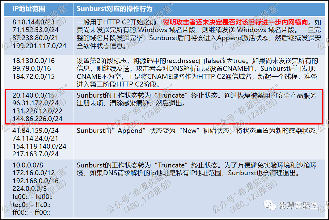 首先,Sunburst后门发起了ea99hr2sfen95nkjlc5g.appsync-api.eu-west-1.avsvmcloud.com的dga域名请求,C2服务端的攻击者打算让这个后门永久停止退出,于是将这个dga域名解析到ip地址96.31.172.116,Sunburst获取到这个ip之后,查询如下列表,然后立即转为”Truncate”状态,清除各种痕迹后,永久终止执行。