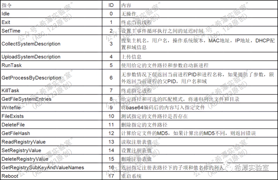 Sunburst通过解析上述xml文件中的加密部分,得到指令ID和指令的附加参数。参考如下表格,如果指令对应的ID是Exit,就是终止当前线程,如果是SetTime,就结合解密出来的附加参数设置延迟时间。