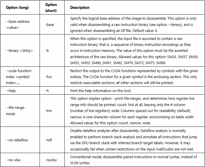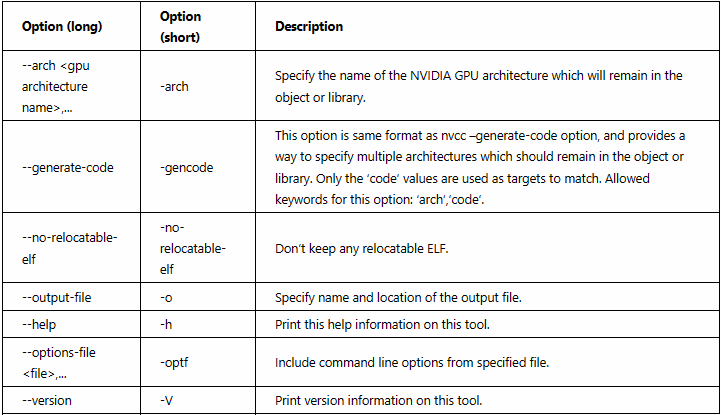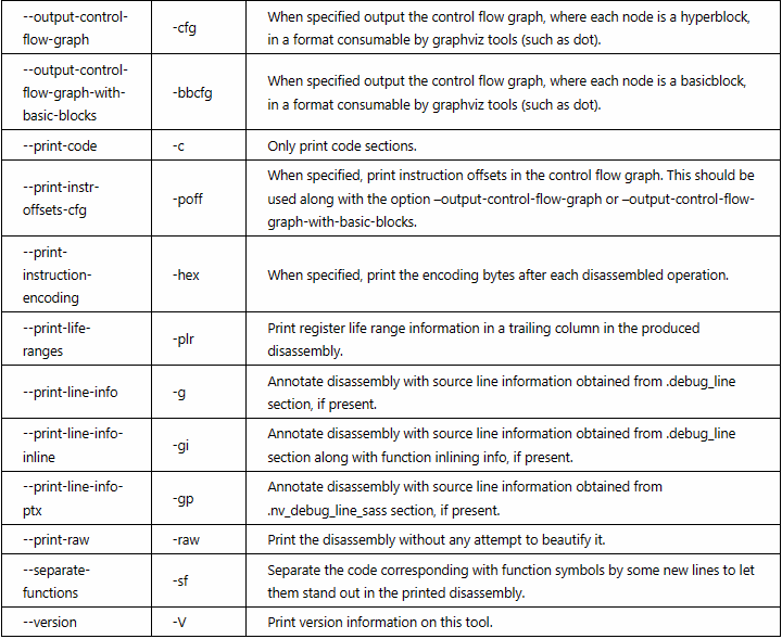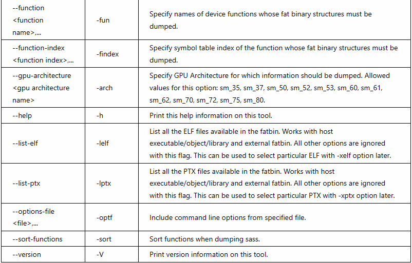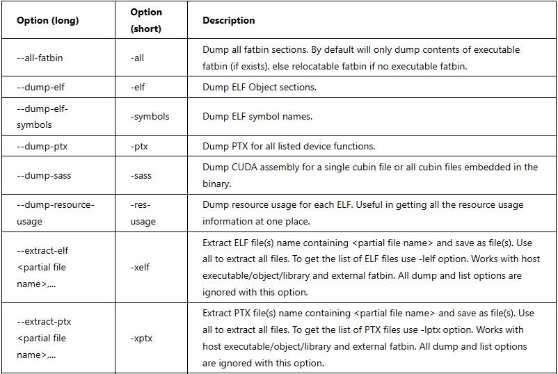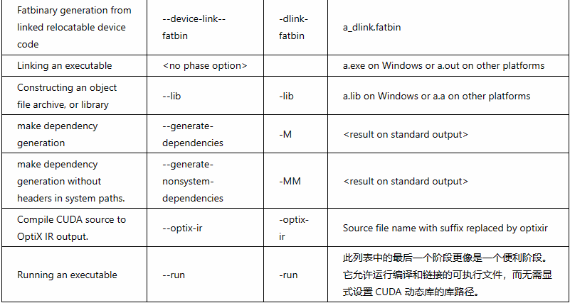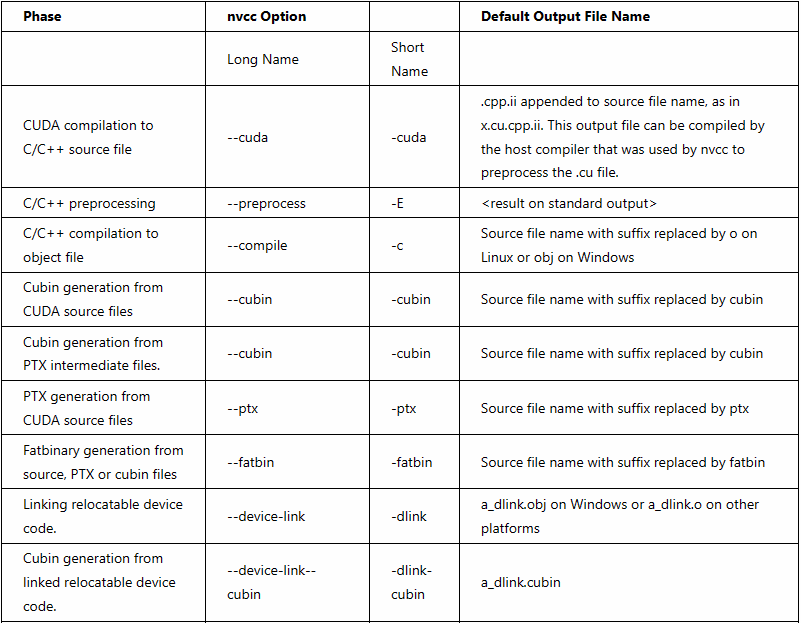 下表指定了支持的编译阶段,以及启用此阶段执行的 nvcc 选项。它还列出了此阶段生成的输出文件的默认名称,这将在使用选项 --output-file 未指定显式输出文件名时生效: