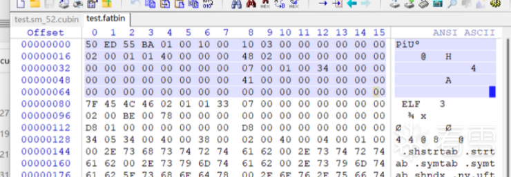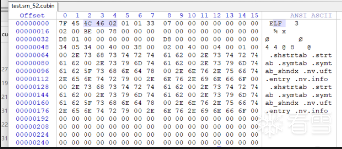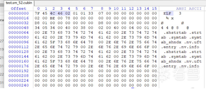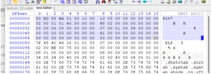◆使用fatbinary将test.sm_52.cubin和test.ptx打包为test.fatbin,并将test.fatbin嵌入到test.fatbin.c中可以看见test.fatbin偏移0x50就是test.sm_52.cubin