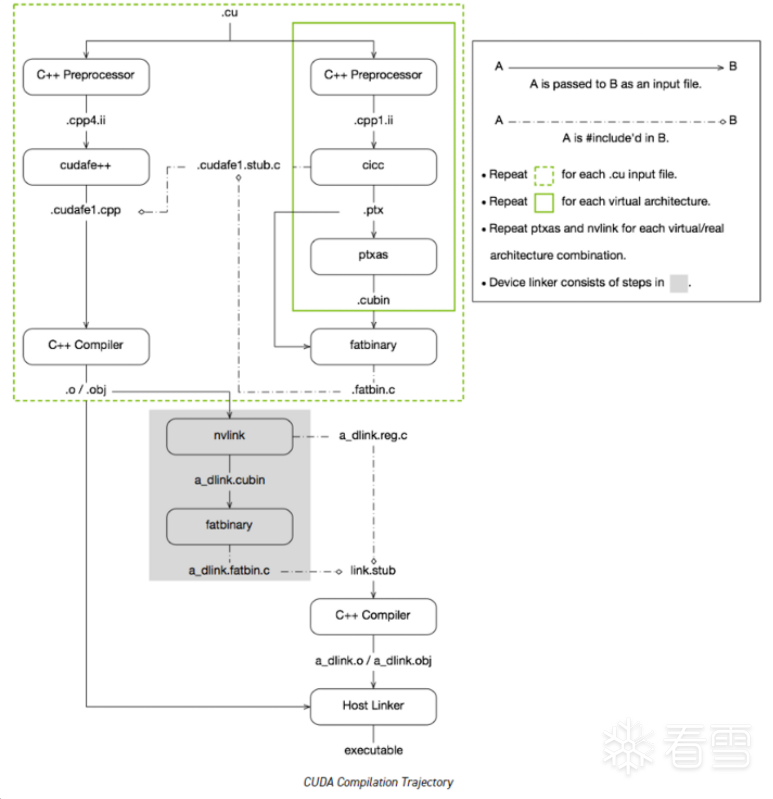 编译轨迹涉及每个 CUDA 源文件的多个拆分、编译、预处理和合并步骤。