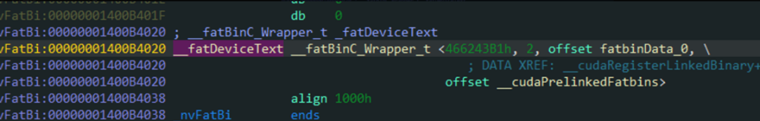 __fatBinC_Wrapper_t第三个参数就是指向的真是的 fatCubin,而 fatCubin 的最开始的元数据是结构体struct fatBinaryHeader 。