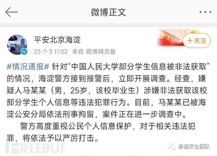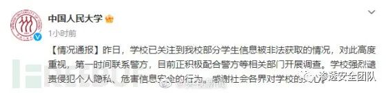 人民大学学生信息被盗一事引起社会广泛关注,人民大学很快便做出回应。7 月 2 日,中国人民大学官方微博账号发布情况通报表示,学校已关注到我校部分学生信息被非法获取的情况,对此高度重视,第一时间联系警方,目前正积极配合警方等相关部门开展调查。学校强烈谴责侵犯个人隐私、危害信息安全的行为。感谢社会各界对学校的关心。