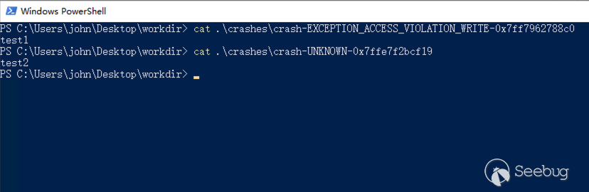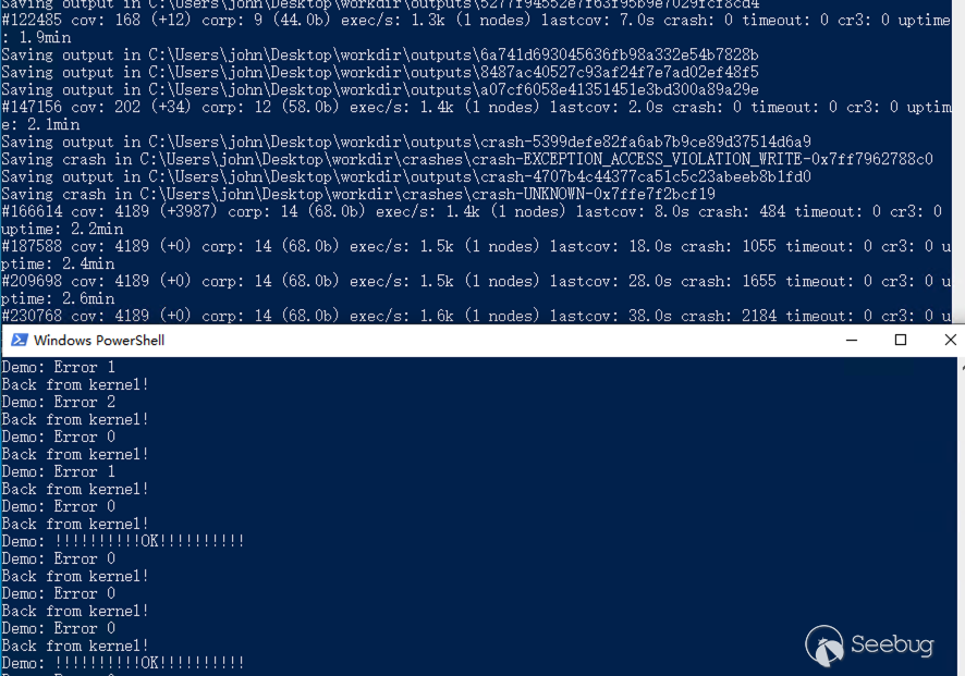 $ .\wtf.exe fuzz --name demo --backend=bochscpu --target C:\Users\john\Desktop\workdir启动执行 2min 即可获得 crash 如下: