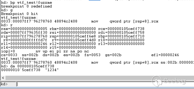 此时,我们需要选择一个「合适」的内存快照位置,因为 wtf 将会以该快照作为起始运行状态,在 wtf_test.exe 中,我们的目标函数是 fuzzme(),所以我们在 fuzzme() 函数入口打下断点,并在 wtf_test.exe 程序中分别输入 g 和 1234 以运行到断点处,如下: