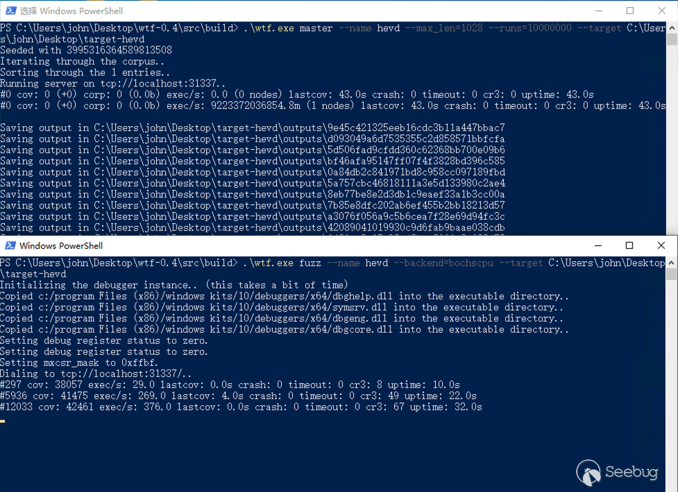 $ .\wtf.exe master --name hevd --max_len=1028 --runs=10000000 --target C:\Users\john\Desktop\target-hevd