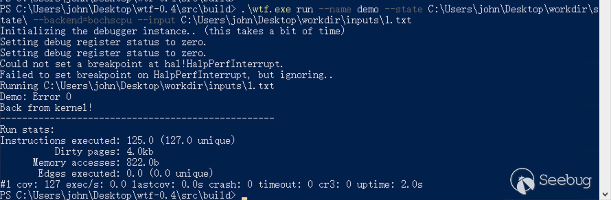 $ .\wtf.exe run --name demo --state C:\Users\john\Desktop\workdir\state\ --backend=bochscpu --input C:\Users\john\Desktop\workdir\inputs\1.txt执行如下: