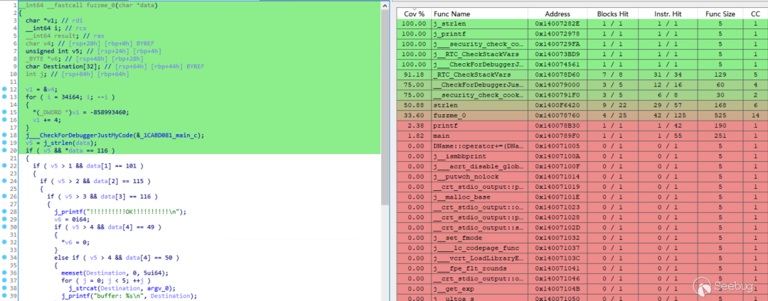 使用 wtf 的 run 子命令还可以生成路径覆盖,配合 IDA 以及 lighthouse 插件可以帮助我们排查 fuzz 问题和衡量 fuzz 的质量,如下:
