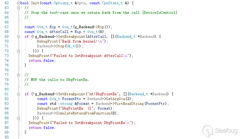 插件主要需要实现 Init() 和 InsertTestcase() 两个函数,wtf 加载内存快照后,将停留在我们打下断点/打下快照的位置,然后首先调用一次插件的 Init() 函数,在该函数中一般定义了:1.快照运行到何处停止、2.如何处理异常错误、3.如何处理IO 等操作,完成初始化操作后,随后将在每次执行快照前,调用 InsertTestcase() 函数注入测试用例。