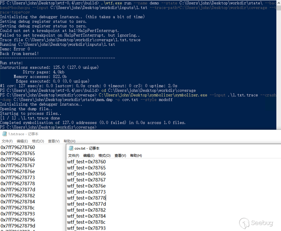 $ .\wtf.exe run --name demo --state C:\Users\john\Desktop\workdir\state\ --backend=bochscpu --input C:\Users\john\Desktop\workdir\inputs\1.txt --trace-path=C:\Users\john\Desktop\workdir\coverage --trace-type=cov执行完毕后将在 C:\Users\john\Desktop\workdir\coverage 下生成 1.txt.trace 文件,该文件没有符号化不能直接使用,使用作者提供的工具 symbolizer(https://github.com/0vercl0k/symbolizer) 对其进行符号化处理: