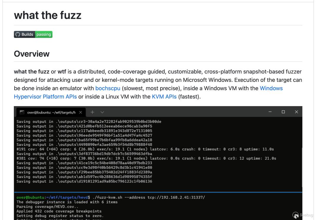 wtf (https://github.com/0vercl0k/wtf) 是一种分布式、代码覆盖引导、可定制、基于快照的跨平台模糊器,设计用于 fuzz 在 Microsoft Windows 平台上运行的用户模式或内核模式的目标。