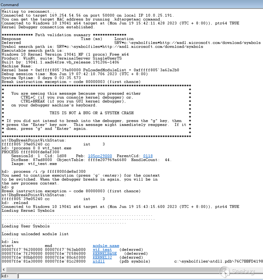 随后使用 debugger 使用 WinDBG 网络调试连接 debuggee,随后在 debuggee 上执行 wtf_test.exe 程序,在 WinDBG 中进入目标进程空间如下: