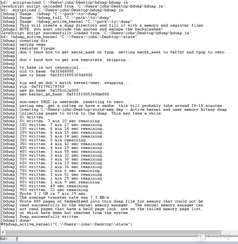 kd> !bdump_active_kernel "C:\\Users\\john\\Desktop\\state"执行如下: