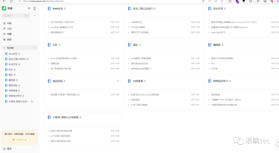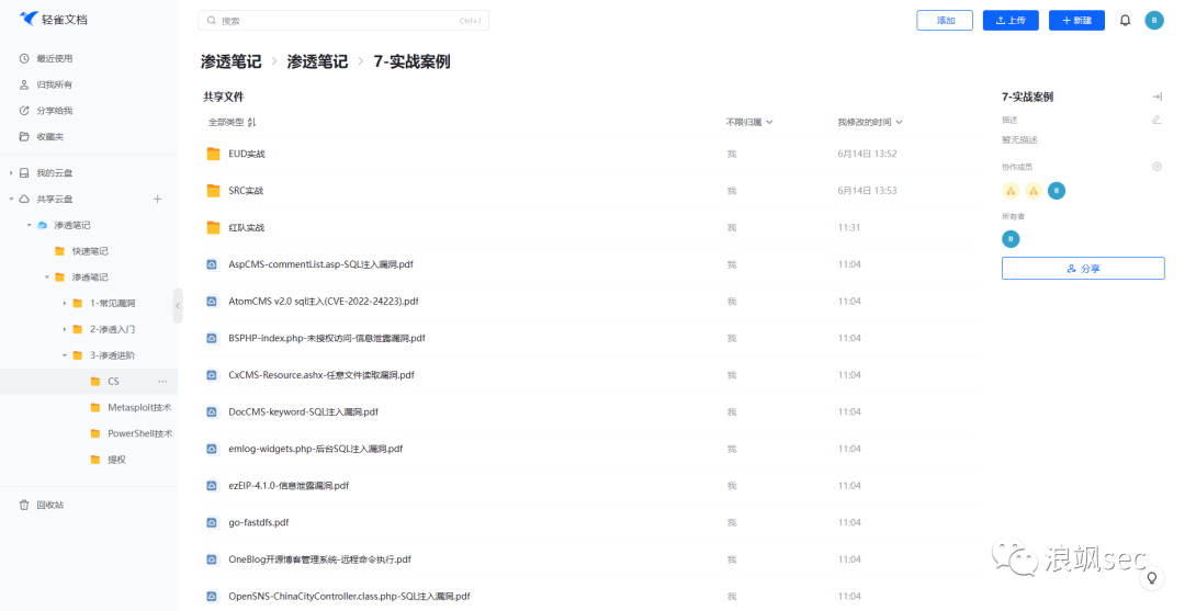 有自己总结的,也有从互联网搜集的,包含实战案例、hw中的漏洞总结、一些渗透工具、技术分享、绕过技术、应急响应案例等内容,相对比较全面,后面也会继续完善。
