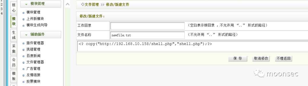 在文件管理里新建一个txt 然后用copy函数 把远程的webshell后门 复制到本地