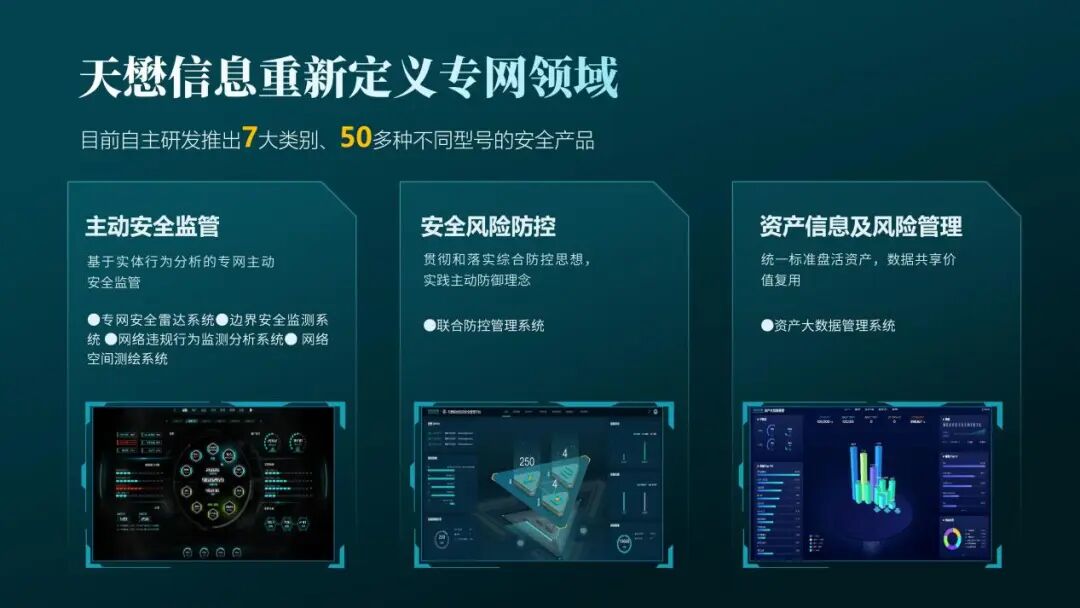 天懋信息在专网安全和边界安全领域有多年的技术积累,在此领域拥有80余项发明专利和软件著作权。多年来始终以自主创新为发展源动力,以技术研发领先优势开拓市场,率先提出“专网安全主动监管”的思路,将UEBA应用于专网安全,自主研发打造一系列以“TINDAE(天懋网络数据智能分析引擎)”为核心的专网安全系列产品及解决方案,从资产安全、空间测绘、边界安全、网内攻击、信令安全、违规行为、多维数据取证等维度提供主动安全监测与分析,整体提升信息网、视频网、政务网、办公网等多种专网场景的安全能力,赋能客户安全管理,保障专网安全运行。