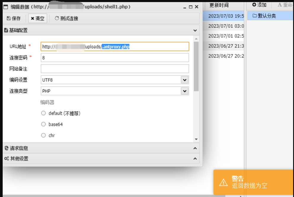 本来到这里就结束了。然后连接.antproxy.php 这个文件, 密码不变。就能够成功连接上。不知道为什么, 我的蚁剑不成功。返回是空, 有知道的大佬, 求知道下