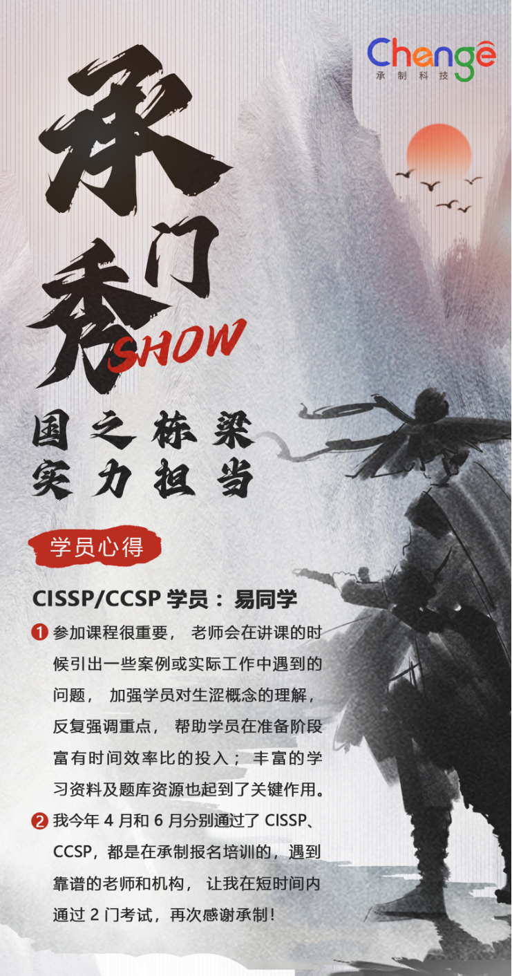 承制科技授课模式采用经典培训+分章节知识点详解+分章节习题辅导+综合模拟+考前串讲及辅导+督促学习等形式进行。只要学员积极配合学习,完全可以360度掌握知识体系和精通考核知识点,在考试中以坚实的基础和实力以不变应万变,大概率顺利通过CISSP/CCSP考试。