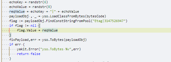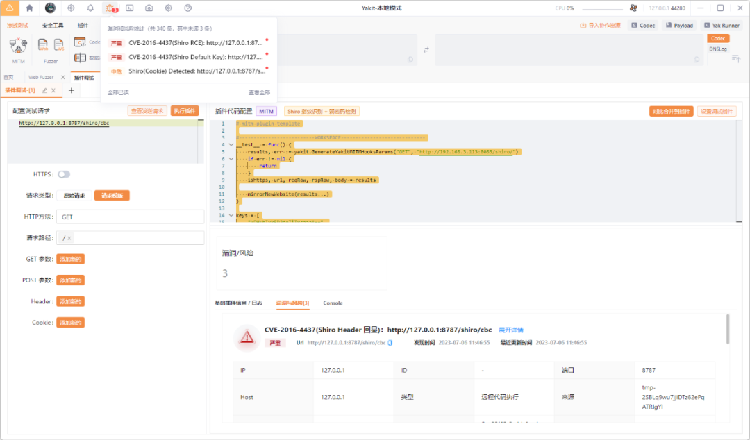 在步骤 d 中,为了保证回显的随机性,我们执行的操作是:先加载回显的 Class 文件,在 Class 常量池中找到我们预设的常量值,替换为随机值,得到修改后的 Class 字节码。得益于 Yaklang 完善的 java 字节码相关的基础设施,上述的操作十分的简单,仅需如下几行代码即可完成:当 a,b 步骤通过时,插件会发出一个风险提示——检测到 Shiro(Cookie) 框架使用当 c 步骤通过时,插件会发出第二个风险提示——(Shiro 默认 KEY)当 d 步骤通过时,插件会发出第三个风险提示——(Shiro Header 回显)当 d 不通过且 e 步骤通过时,插件会发出第三个风险提示——(Shiro 利用链探测)在知道了我们 Shiro 插件的检测逻辑后,我们就可以开始写对应的靶场逻辑了,根据上面的检测逻辑,我们的靶场逻辑如下:启动靶场时,随机使用 Shiro Key 列表中的一个当作默认的 Key,随机使用 Gadget 列表(CB183NOCC、CB192NOCC、CCK1、CCK2)中的一个,模拟可利用链