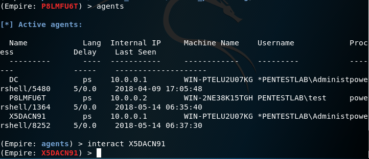 可以使用命令代理来检索活动代理的列表。以下命令将与新代理 X5DACN91 交互。interact