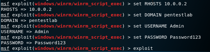 Metasploit 还有一个可以通过 WinRM 服务执行任意命令的模块。该模块需要本地管理员凭据、域和目标主机。
